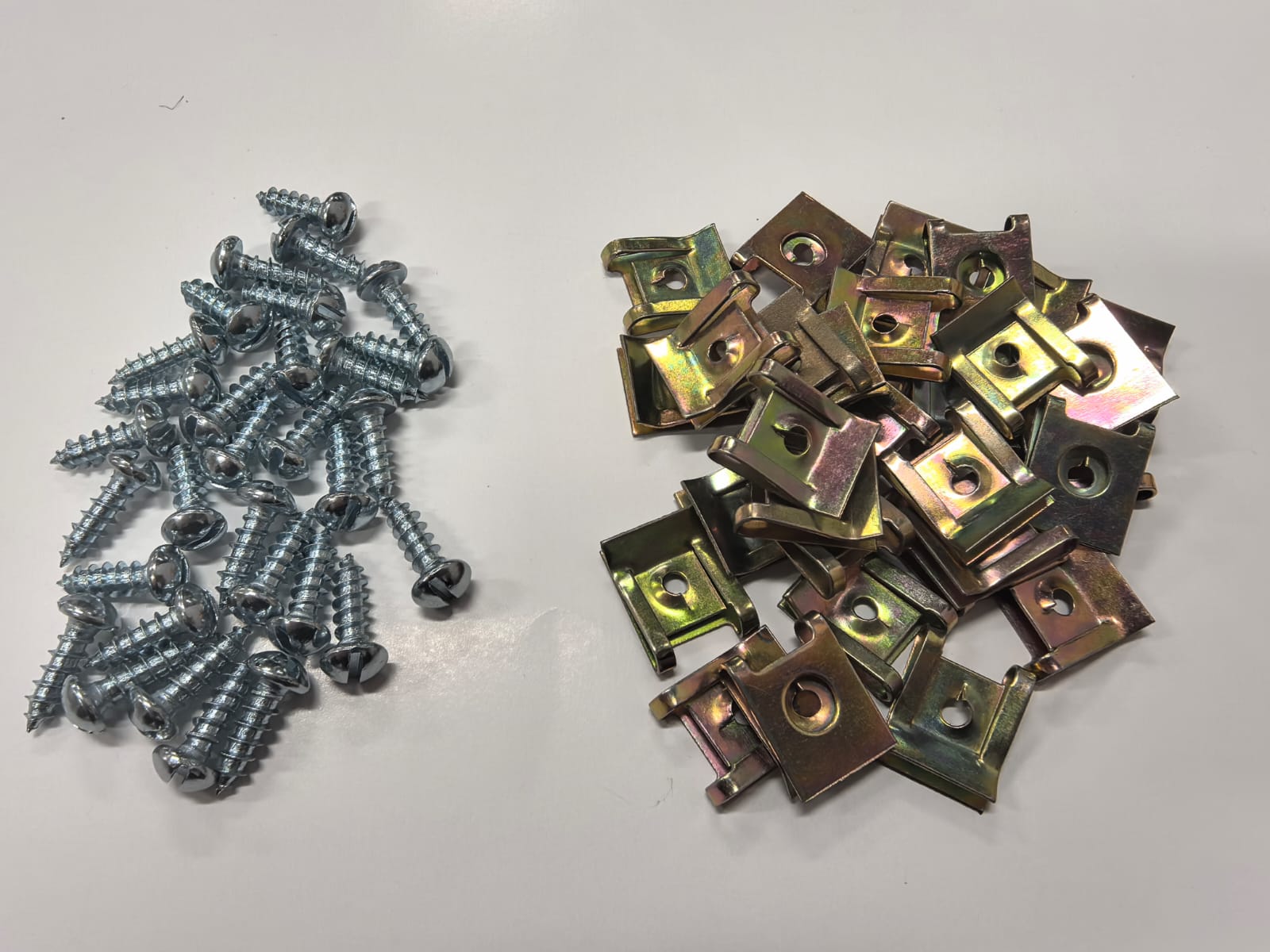 саморез автомобильный - 30 штук скоба под саморез автомобильная - 30 штук это универсальный крепеж, подойдет, почти на любой автомобиль! саморезы автомобильные со скобой; скоба под саморез; саморез с клипсой; автомобильные саморезы; саморезы с закладными Универсальный автомобильный крепеж: саморезы с пружинной скобой M5 (30 комплектов) Краткое описание: Набор универсального крепежа для быстрого и надежного монтажа элементов в автомобиле. В комплекте 30 саморезов и 30 пружинных скоб (клипс) размера M5. Широко применяется для установки брызговиков, подкрылков, облицовки и других элементов. Полное описание: Ключевые преимущества: Универсальность: Крепеж совместим с многими марками автомобилей, включая VAG, KIA, Лада, Toyota и другие. Полный комплект: В набор входит все необходимое — 30 саморезов и 30 ответных пружинных скоб (закладных клипс). Надежная фиксация: Пружинная скоба обеспечивает плотный прижим и надежное крепление детали, предотвращая самопроизвольное откручивание. Простота установки: Монтаж не требует специального инструмента или навыков. Саморез легко вкручивается в скобу, которая фиксируется в монтажном отверстии. Коррозионная стойкость: Цинковое защитное покрытие обеспечивает долговечность крепежа в условиях эксплуатации автомобиля. Область применения: Предназначен для крепления различных элементов кузова и облицовки: Брызговики (подкрылки, локеры) Защита картера двигателя Элементы внутренней облицовки арок Некоторые виды бамперов и спойлеров Декоративные накладки и молдинги Комплект поставки: Автомобильный саморез M5 — 30 штук Скоба (клипса) пружинная закладная M5 — 30 штук Ключевые слова для поиска: автомобильный саморез, скоба под саморез, саморез с клипсой, крепеж для подкрылка, метизы автомобильные, саморезы M5, скоба закладная, крепление брызговика, универсальный крепеж, VAG, KIA, Лада, Toyota, Hyundai, Renault, Ford, хомуты автомобильные, пистоны, клипсы, пружинная скоба.